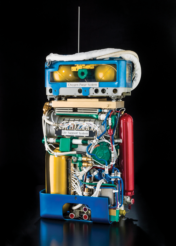 The PLSS also had to be designed so it could be recharged between moonwalks. Consumables such as water, oxygen, lithium hydroxide and battery power needed to be easily replenished or changed out for fresh components. (The lithium hydroxide would be packed into cylindrical cartridges that were discarded once depleted.)