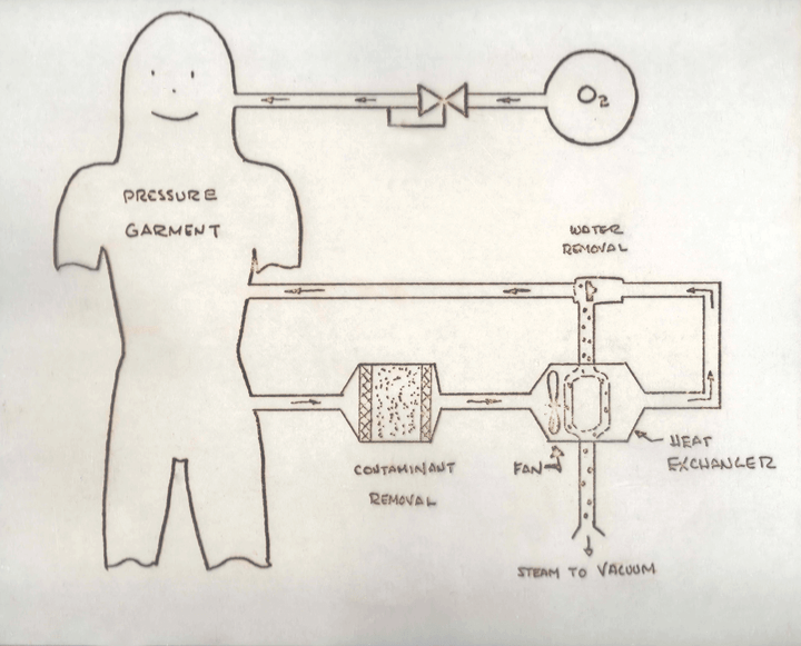 Over time, oxygen would be removed from the closed system by suit leakage or oxygen that had been converted into carbon dioxide and subsequently removed from circulation by the lithium hydroxide. The primary oxygen system provided pressurisation via a single-stage in-flow pressure regulator and replaced the oxygen lost in this way.