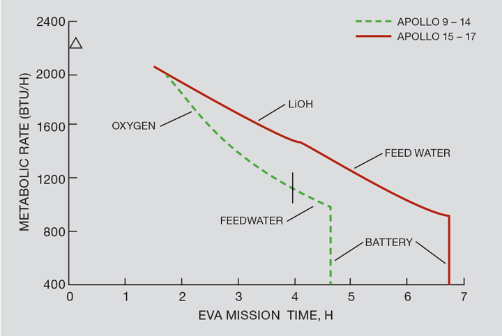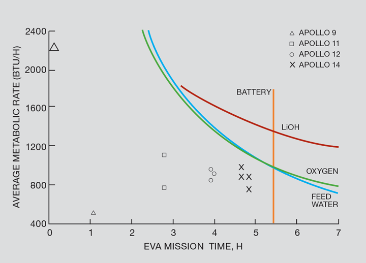 Figure 7 shows the measured duration of PLSS consumables as a function of calculated metabolic rate and clearly shows that the PLSS design met or exceeded its performance requirements. In addition, the metabolic rates experienced on the Moon were below the assumed 1,200 Btu/h design criteria for a four-hour EVA (see Table 1). In fact, the initial measurements of metabolic rate on Apollos 11 and 12 gave the engineers and mission planners the confidence to exceed the 4-hour time constraint spent on the surface by the Apollo 14 crew.