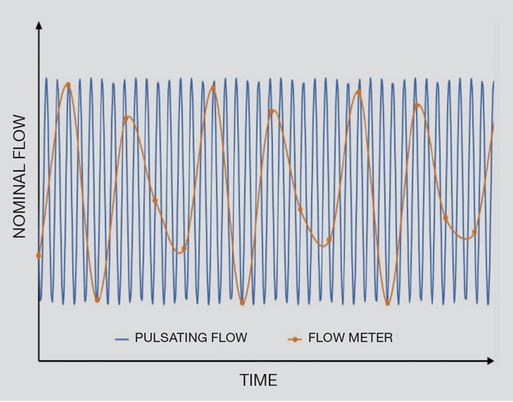 Electronic-based meters may not perform well with pulsating flows as there could be aliasing between the meter’s cycle time and the pulsations, causing drastic reading errors. Positive displacement flowmeters would provide a better outcome where pulsating flows are integral to the process (see Figure 2).