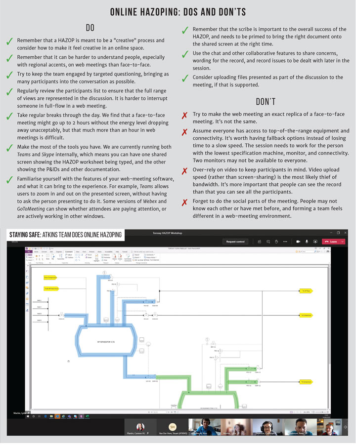 They had some issues with Zoom, and quickly ended up on Teams as a platform. The majority of sessions were reduced to no more than four hours actual HAZOP time per day to maximise the energy of the team, break times were agreed at the start of each session, and wrap-ups were conducted to capture feedback on what went well and what challenges were faced in conducting the HAZOP remotely. The lessons were then shared with colleagues.