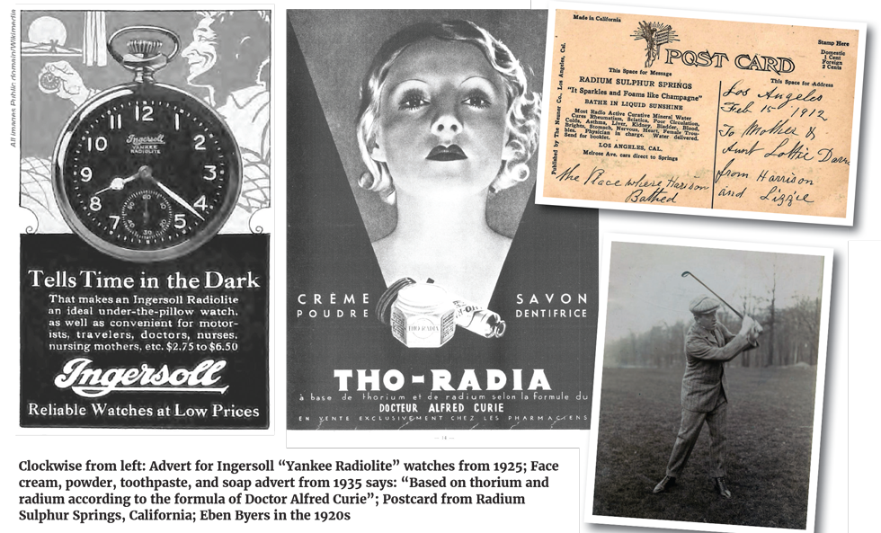 American champion golfer and influencer of the time Eben Byers (1880–1932) swore by his daily drink of Radithor containing a microcurie each of both radium and thorium. Byers reportedly drank as many as three bottles a day, amounting to nearly 1,400 bottles before he realised the radioactive water was rotting his body from the inside. Eventually, minus a jaw, which had decayed and with holes forming in his skull and abscesses on his brain, Byers died of multiple cancers. He was buried inside a lead-lined coffin designed to absorb the radiation (Marie Curie’s body was also deemed dangerously radioactive when she died of aplastic anaemia).