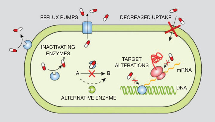 The other major bacterial defence mechanism is to modify the target on which the antibiotic acts. In fact, this is how the well-known superbug MRSA (methicillin-resistant Staphylococcus aureus) works. Through expressing a new penicillin-binding protein with low affinity to b-lactam antibiotics, this prevents targeting of the bacterial cell wall.