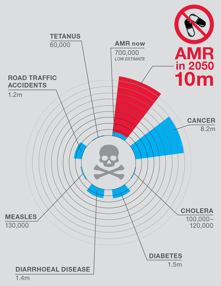 Today, an estimated 700,000 deaths per year worldwide are attributable to AMR. Compared with cancer (8.2m), diabetes (1.5m), and road traffic accidents (1.2m) these numbers are relatively small (see Figure 2), which has somewhat overshadowed the looming threat of AMR. However, in 2014, a review1 led by economist Lord O’Neill concluded that if we continue on our current trajectory, a continued rise in resistance would lead to 10m deaths per year from resistant microbes by 2050, which would cost the world economy an estimated US$100trn.