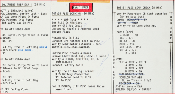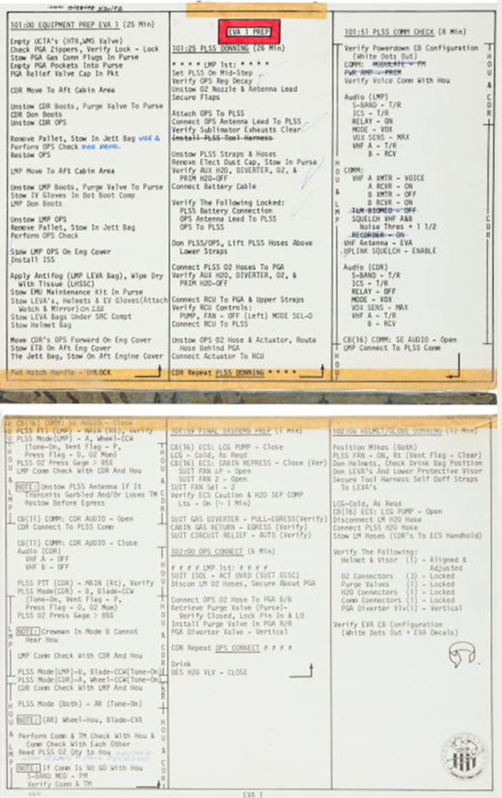 The EVA cue card is a carefully choreographed set of instructions, printed on non-flammable paper which had been developed and subsequently manufactured by the Scheufelen paper company in Germany. Hung up high on Orion’s main instrument panel, it was easily accessible to both crew members.