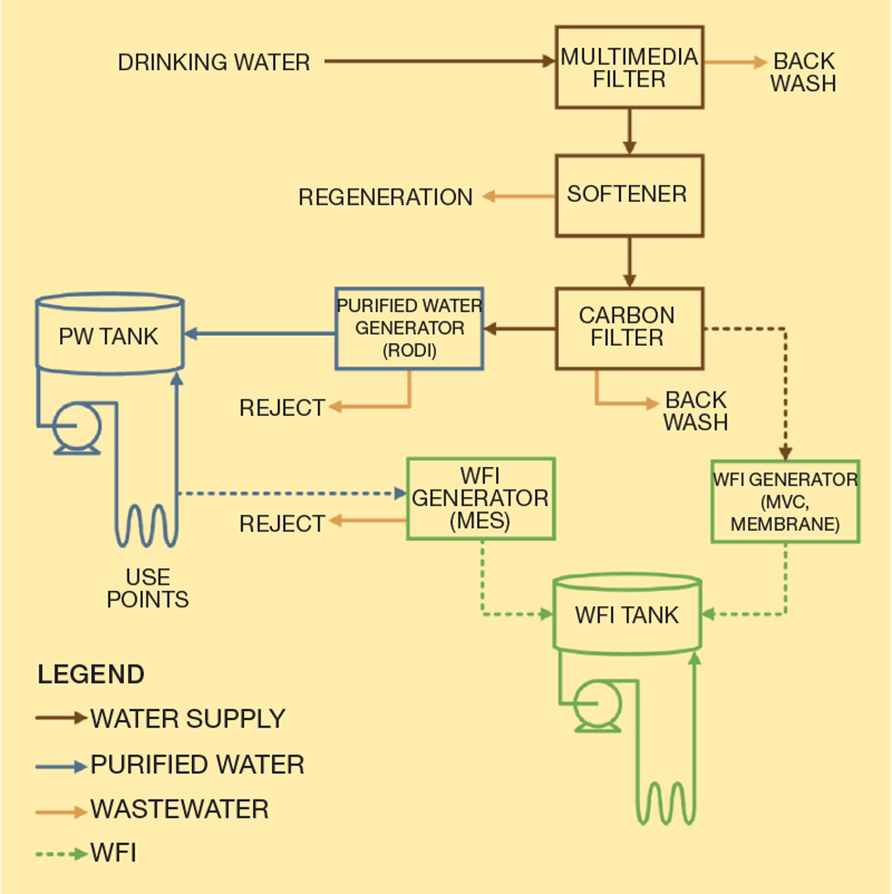 IN THEIR quest to reach sustainability goals, biopharmaceutical manufacturers are targeting their water systems. Water purification systems consume significant electrical and, often, thermal energy. Byproduct wastewater streams from water systems may contain high mineral content which may have a direct impact on the environment. These water systems also require constant monitoring and maintenance to ensure the water consistently meets stringent quality requirements.