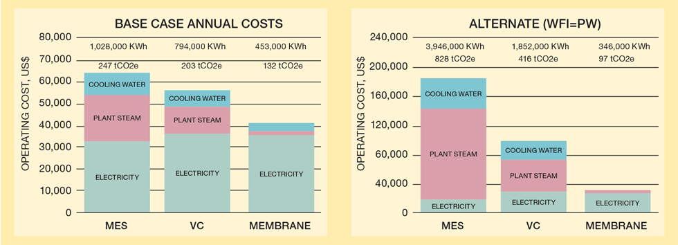 Figures 2a and 2b summarise the results of the analysis for the base case and the alternate design, respectively, showing the annual operating costs, energy consumption and carbon emissions. Costs are based on current typical values in the US, with plant steam generated from natural gas boilers; electrical steam generation doubles the cost and carbon emissions in the case study’s geographical location, where electricity has a higher carbon value than natural gas. The base case comprises separate storage and distribution systems for purified water and WFI.