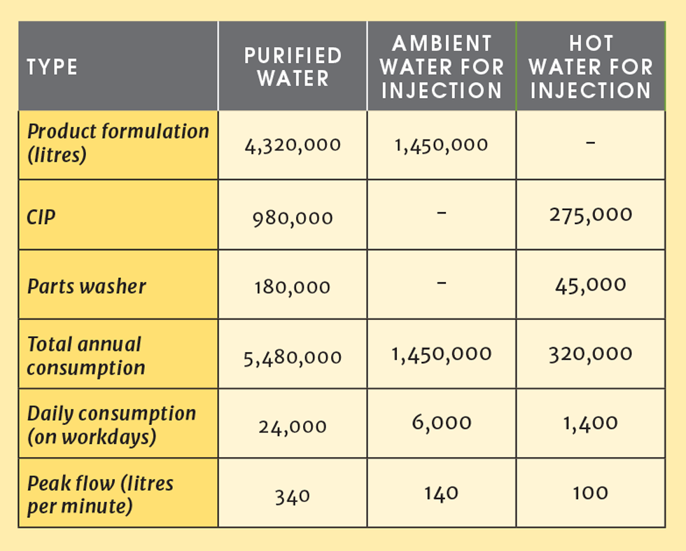 The study starts with quantification of the WFI and purified water demands, which are being used as a baseline. Peak flow rates, daily use, and annual totals are defined for the system. The system boundary extends from the delivery of drinking water through storage and distribution to the use points. Variations to the baseline are defined, showing how deviations from the baseline quantification might impact the results of the analysis. In order of increasing purity, water is needed for general cleaning, humidification, critical cleaning, blending into solutions that contact process equipment (eg phosphate buffers used in chromatography columns), and formulated into drug products (eg injectable drugs).