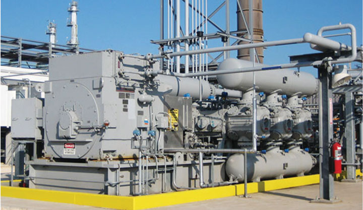 Reciprocating (or piston) compressors use a motor, sometimes with a linear drive, to move a piston or a diaphragm back and forth. This motion compresses the hydrogen by reducing the volume it occupies. These compressors can be large, heavy pieces of equipment. Figure 3 shows a 145 mm stroke 720 RPM compressor, taking hydrogen at 30 barg and delivering it at 50 barg. The motor power is 3.36 MW.