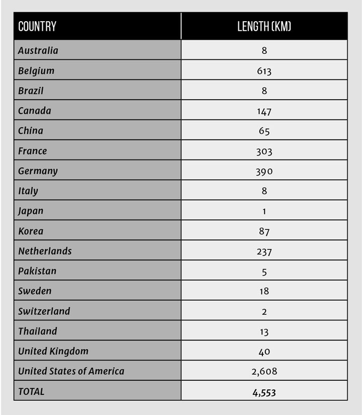 Hydrogen has been transported by pipeline since 1938. Between the Rhine and Ruhr areas of Germany a 250-300 mm diameter, 240 km long line constructed of a standard grade of pipe steel, has been carrying hydrogen at a pressure of 20–210 bar.4 Since then, hydrogen pipelines are to be found in many different countries (see Table 2) and new ones are being constructed.