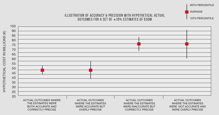 By accuracy, we are talking about whether, on average, the cost estimates match the actual cost outcome. By precision, we are talking about whether the accuracy range claimed for the estimates is validated by the range of actual outcomes in a sample set.