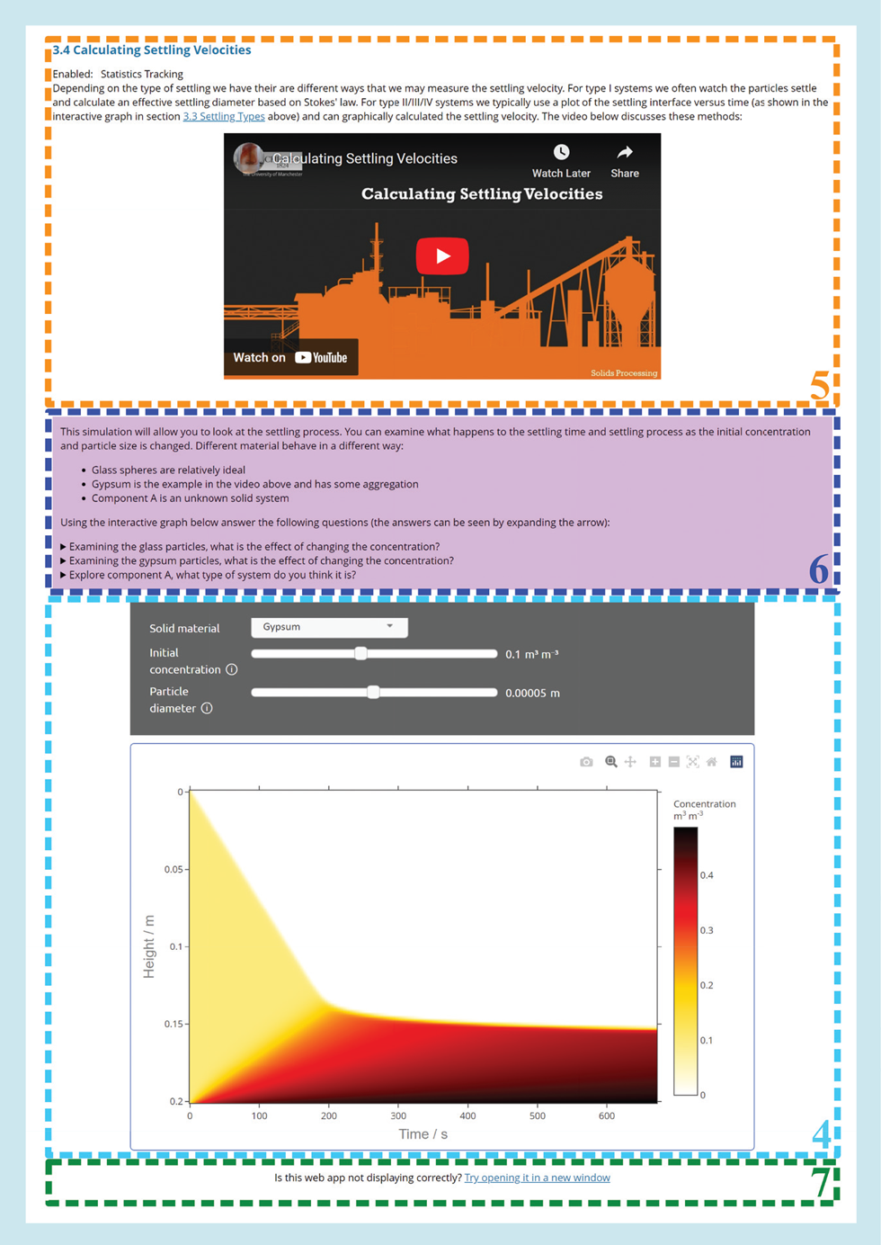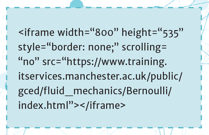 Figure 2 is an example implementation into Blackboard, the VLE system used at The University of Manchester. The main interactive graph with control sliders, Panel 4, is viewable seamlessly with the weekly learning content, for example a mixture of short videos, self-test quizzes, and key information, as in Panel 5. We also tend to use a hard link, Panel 7, if students need to open the graph in a separate window, either for a larger version, or if there are any issues with their Blackboard version.