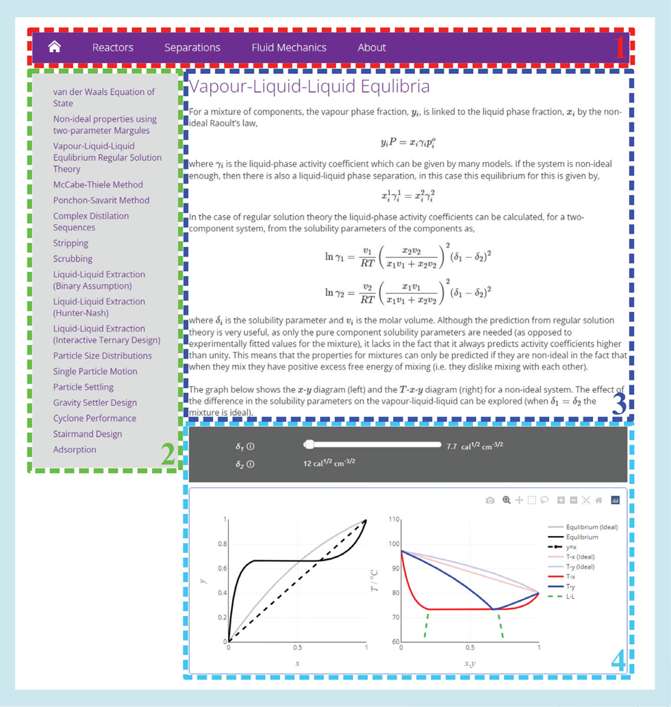 The general webpage for each topic is divided into four main panels as illustrated in Figure 1. Panel 1 is the navigational header bar to move the user between subject areas of the site (Reactors, Separations, Fluid Mechanics, About). Panel 2 is the content panel to move the user between the different topics within a specific subject area. Panel 3 is an introductory and/or theoretical information section about the topic (the content in this area changes depending on the topic and can be text, equation, or video recordings), and Panel 4 presents the main interactive graph with control sliders. When a page is called from an external application, for example a VLE, only Panel 4 is displayed.