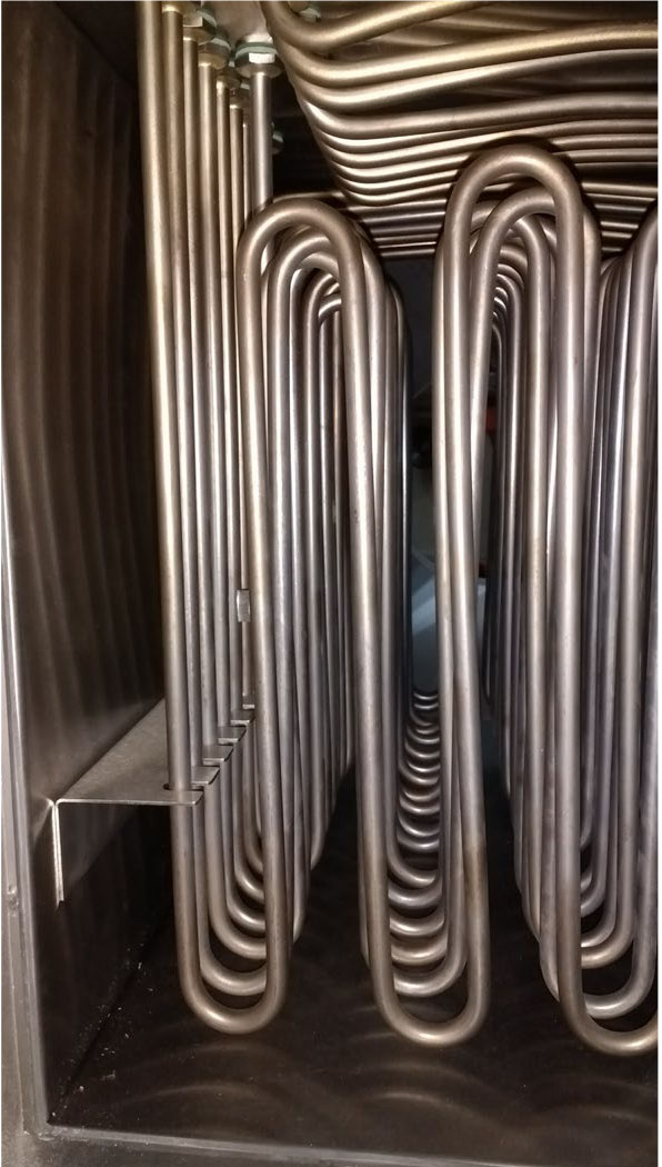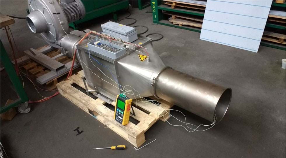 Ordinary process heaters can quickly reach surface temperatures exceeding 600°C, well above the minimum ignition temperature (MIT) of tea dust particles, which is around 510°C. Following ATEX guidelines, we calculated the maximum allowable surface temperature by taking the lower of two values: two-thirds of the MIT or the smouldering temperature minus 75°C. This calculation resulted in a maximum surface temperature of 225°C for our heater.