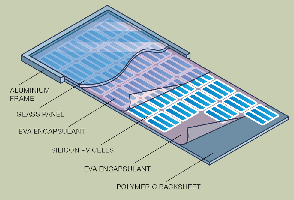 Currently, management of solar panel waste generally involves removal of the frame – which can be reused or downcycled – before the remaining components are crushed and landfilled. Excluding the frame and junction box, solar panels are typically comprised of solar cells sandwiched between front glass and a back sheet, with layers of the encapsulant ethylene vinyl acetate (EVA) between. Those exploring recovery begin by separating these layers before crushing up the cells into powder and using chemical leaching to recover reuseable materials.