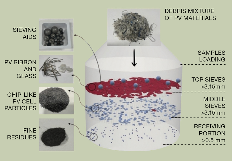 The patented aspect of the process is the use of steel balls for more effective material separation. To achieve this, at benchtop scale, researchers load the steel balls into the top of a vibrating and tiered sieving container, along with the shredded PV cell debris. Different sieve sizes hold back different debris, and fine residue collects at the very bottom. The group can then recover valuable material such as silver via leaching. Shen said silver recovery is the ProMO group’s current focus.