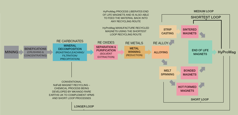 Mkango Resources, which owns 90% of HyProMag through its subsidiary Maginito, is building a pilot line to complement HyProMag’s process. The process will chemically strip out rare earths from recovered material to pass back through magnet production, beginning at the mineral decomposition stage (See Figure 1).