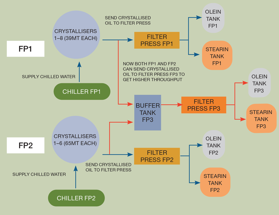 THE PALM fractionation plant process involves crystallisation and filtration as shown in Figure 4, where refined, bleached, deodorised palm oil (RBDPO) from the refinery is crystallised through a series of cooling steps and sent to the membrane filter press for separation to obtain olein (liquid oil) and stearin (solid fats). Shyam Lakshmanan and the Dry Fractionation team at IOI Edible Oils take us through the challenges they overcame to make the process greener.