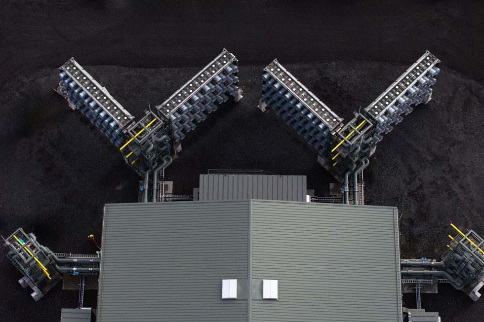 To release this captured CO2, the doors on the collectors are closed and steam produced from an onsite geothermal power plant heats up the sorbent material to around 100°C. This frees a concentrated stream of CO2 mixed with steam that is piped to a process hall for further purification. From here on in, Climeworks is making use of established processing technologies.