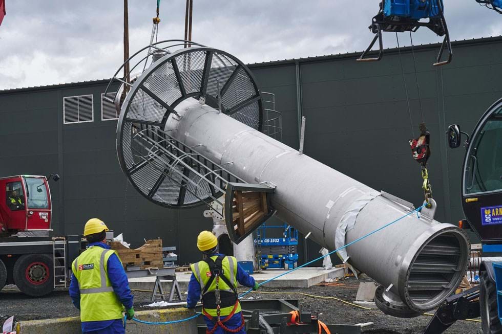“It’s essentially a SodaStream on steroids,” says Douglas Chan, COO of Climeworks. Absorption water is injected at the top of the tower and trickles down through packing that fills the column. The water dissolves the CO2 coming up through the bottom of the tower producing a pressurised mix that is ready for injection underground through two onsite wells operated by project partner Carbfix.