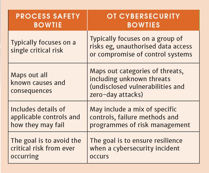 It’s important to acknowledge some key differences between a traditional critical risk bowtie and a cybersecurity bowtie (Table 1). These differences are due to the level of complexity and interconnectedness of OT systems.