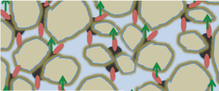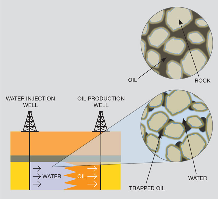 Figure 1 illustrates the pre-waterflood situation with oil contained within the pores of the rock (left) and the situation at end-of-field-life where oil is trapped in locations the waterflood fails to reach and remains unrecovered (right).