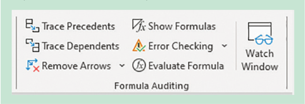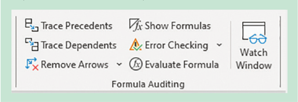 The Formula Auditing section of the Formulas ribbon contains various tools to help you check and debug formulas in your Excel workbook (Figure 1). Hover over a tool to see a short description of its function. The Trace Precedents and Trace Dependents tools help you visualise which cells are referenced by the currently selected cell. Error Checking automatically identifies and highlights potential errors in your formulas and provides suggestions for correction.