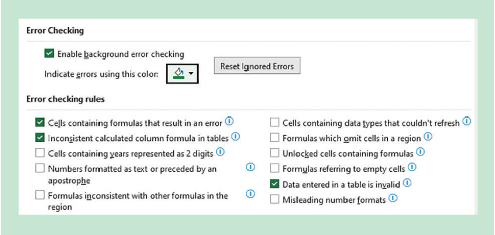 Excel can continuously monitor your workbook for potential problems and flag them with coloured dots in the corner of cells where errors are suspected. Navigate to File…Options…Formulas to customise which types of potential errors are flagged and set the colour of the dot (Figure 2). This allows you to quickly identify and address errors as you work on your spreadsheet.