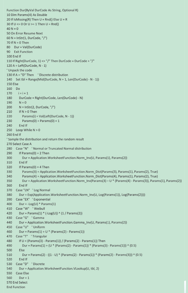 Listing 1 gives my generalised solution as a VBA User-Defined Function (UDF). The function takes two arguments. The first argument is a code letter (or letters) that define the distribution to use, followed by the parameters that the distribution requires with a “/” to delimit these elements. For example, “N/14/2” means, “use a normal distribution with mean 14 and standard deviation 2”. If you use this UDF on a worksheet, by including RAND() for the second argument the resulting random sample will change whenever any cell is changed on the worksheet. The second argument is optional, however, and if it is omitted the result will only change if the input string for the first argument is changed. The beauty of this solution is that an input’s distribution function is changed simply by modifying the input argument; no formulae need to be updated. This UDF can also be called by another subroutine which is handy when a simulation is managed by VBA routines.