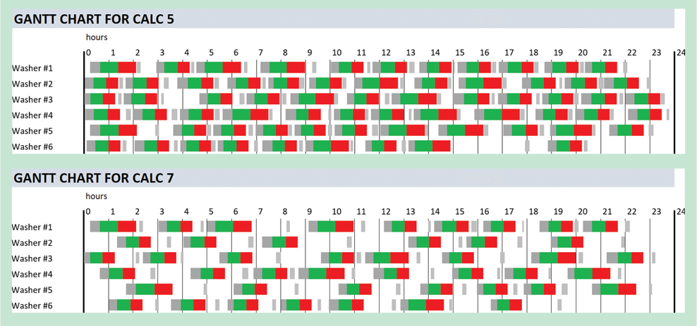 Snips of the matrix are shown in Figure 1 with the water dispensing steps (2 and 6) highlighted. The top snip shows the original cadence from Calc 5. Calc 6 looks at the matrix column by column and when a conflict is found it moves the conflicting load (and subsequent loads in the same washer) to the right by inserting blank cells. This simulates a water supply lock-out that restricts delivery of water to one washer at a time. Calc 7 also locks out operating staff so they can only load or unload one washer at a time. For this run of the model, resolving the conflicts reduced the number of wash loads from 67 to 45. It is clear, therefore, that conflict resolution is an important element to incorporate into this simulation.