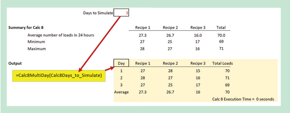 I implemented this as a user-defined function (UDF) subroutine. When a UDF returns an array as its result, the entire array is written to the worksheet. For this example, I averaged the number of loads and placed that value in the last row of the array. Using dynamic naming for each of the columns (eg “lCalc8Recipe1”), I constructed formulas for the daily minimum and maximum loads for each recipe and for the total.