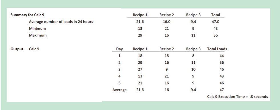 Just like Calc 8, I implemented Calc 9 as a UDF. See Figure 4 for the results of a five-day simulation. Notice that the execution time was just 0.8 seconds, and the summary and output provide the basic information about the expected performance of the wash room.