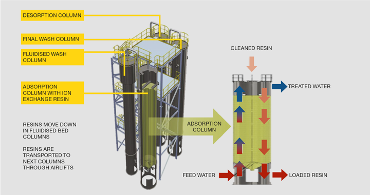 Contaminated water flows in through the base of adsorption columns and leaves out of the top through screening elements. Resin loaded with nitrate is periodically lifted pneumatically from the base of the adsorption column into the separate desorption and washing stages, also operated in counter- current fashion, and progressively removes contaminants and desorbs the nitrate from the resin into a nitrate rich salt brine. This leaves washed, nitrate-free regenerated resin to be returned to the adsorption column.