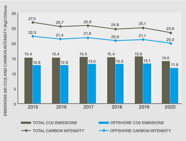 As you can see, total CO2e emissions in 2020 averaged 23.6 kg CO2e/Barrel oil equivalent (BOE). This average measure of "emissions per barrel" is calculated from a large spread of operating oil and gas fields. Depending upon the type of hydrocarbon field – oil, heavy oil, gas, gas condensate – and the operational age, the individual field metrics can vary from around 4 to 35 kg CO2e. Clearly if the UK could produce at the lower end of the metric spread, significant GHG emissions savings could be made.