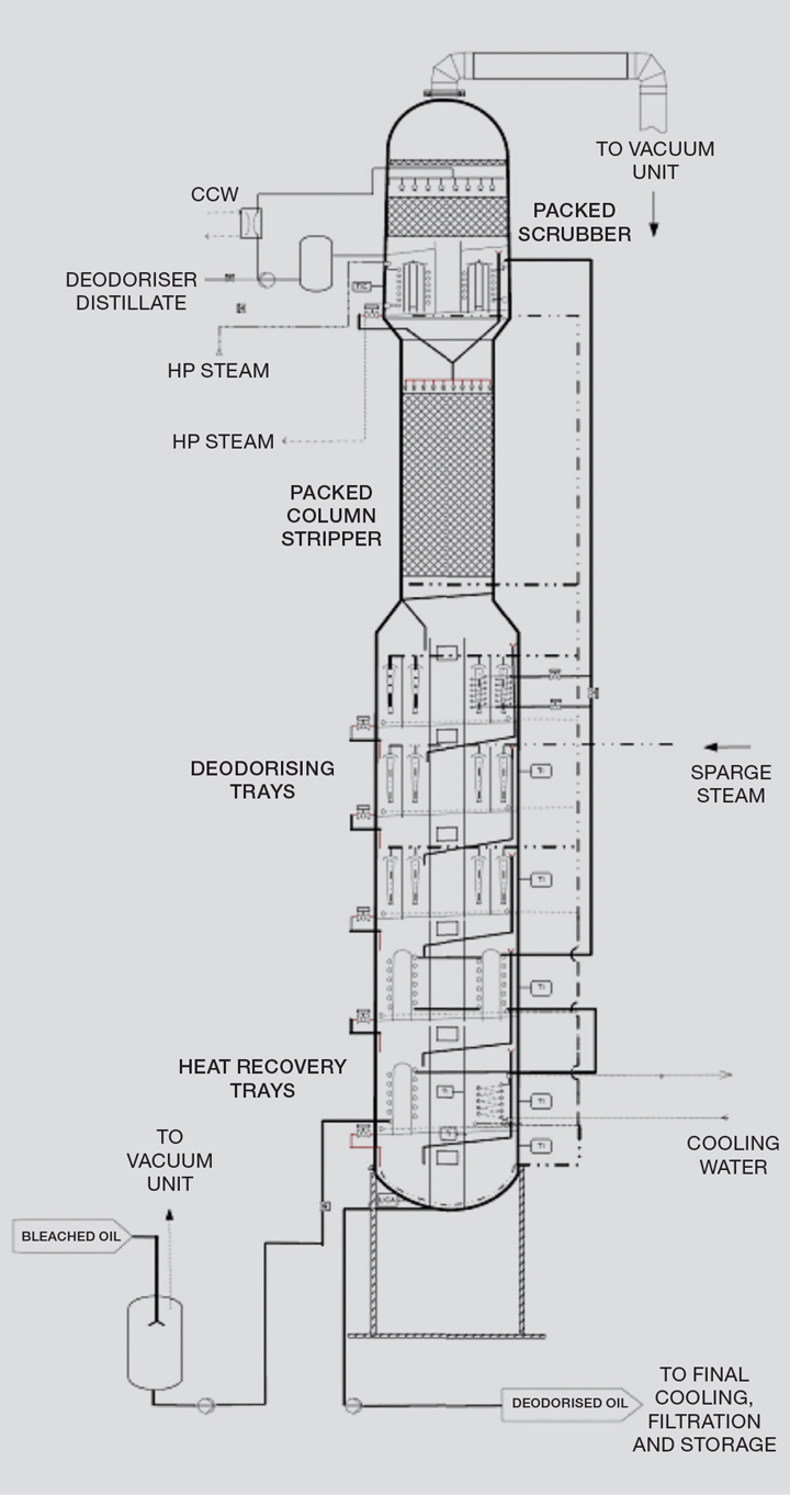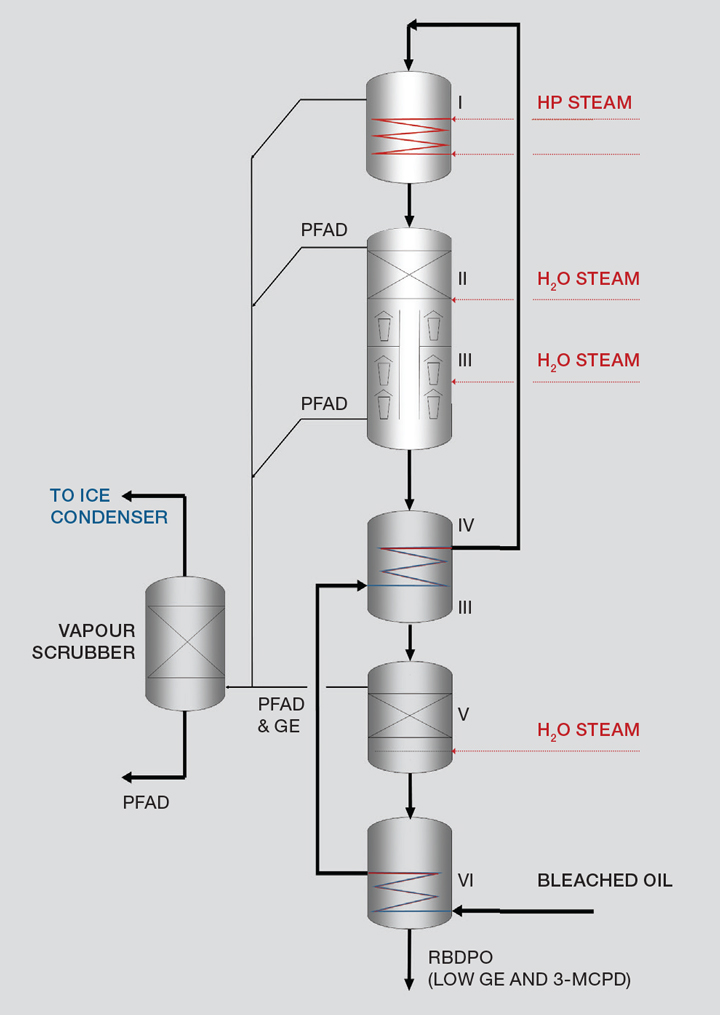 Desmet Ballestra currently recommends a single temperature deodoriser combined with a packed column post-stripper. Operating the deodoriser under standard conditions will result in a bland odour/taste, good shelf life, low FFA and light colour RBDPO. The post-stripper at deep vacuum with ice cooling condenser combined with fast cooling under vacuum will make GE <0.5 ppm possible. The attraction of the post-stripper is that it can be designed as an add-on to existing deodorisers. This is similar to the GE stripping of Alfa Laval.