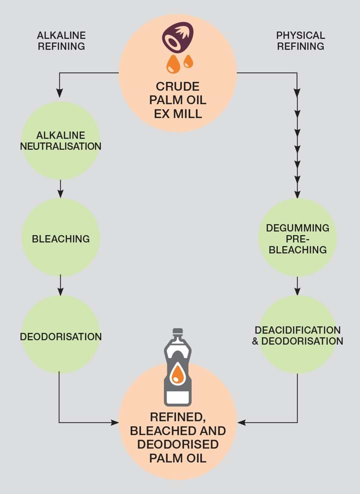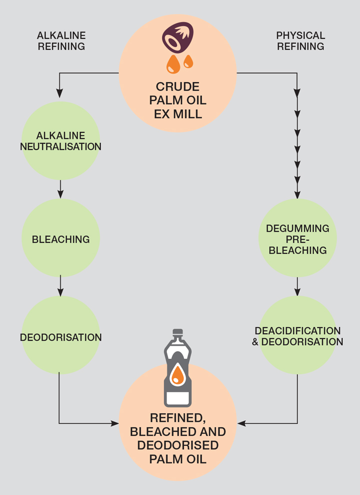To understand the solutions let’s look at the process of refining crude palm oil. Traditionally, the free fatty acids and red colour of crude palm oil are removed by neutralisation with caustic soda and earth bleaching before being deodorised. This is known as alkali refining.