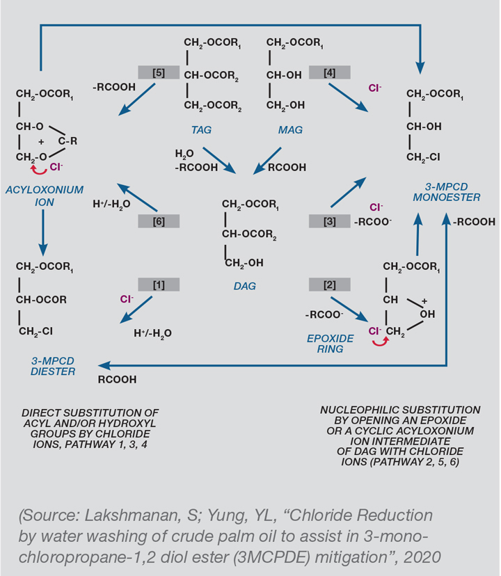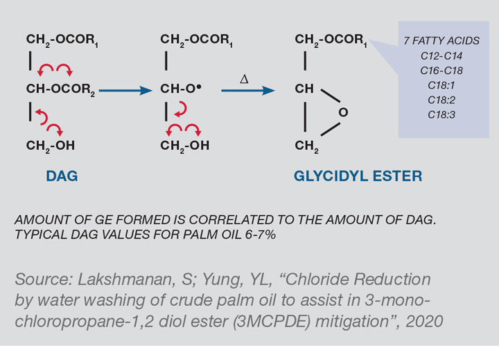 It was found that whilst 3-MCPDE and GE are formed at high temperatures the precursors are the presence of chloride ions and diacylglycerol (DAG) present in crude palm oil. Chloride ions come from fertilisers, pesticides, soil, diluting water, steam condensate, sludge and acidic conditions. The pathways for the formation of 3-MCPDE in the presence of chloride ion is now known.