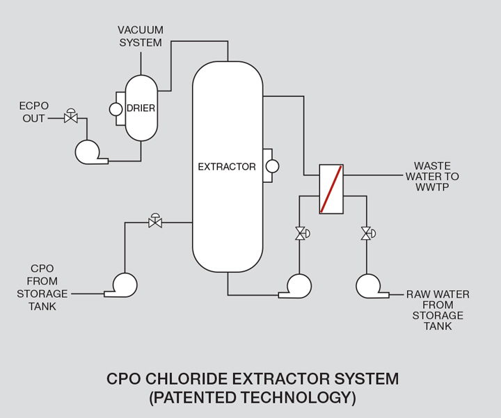 Sumwin offers a patented counter current liquid-liquid (L/L) extraction column for chloride removal in CPO. Given that DAG and MAG are emulsifiers, liquid-liquid extraction in a static non-turbulent column will be emulsion free during washing with nearly no oil in the waste water. A removal of 80% inorganic chlorides to <2 ppm is reported. The design allows for low maintenance.