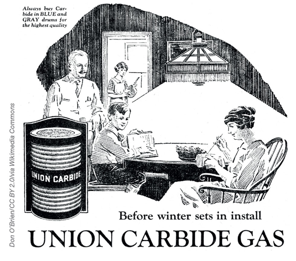 Acetylene (C2H2) is present in small amounts in coal gas, larger amounts helping to give a bright flame. Pure acetylene burns to give the hottest and brightest flame of any hydrocarbon. Hotter than hydrogen, it is used today for cutting and welding. It was discovered accidentally by English chemist Edmund Davy (1785–1857) who was trying to make potassium metal but instead made potassium carbide KC which reacts with water to make acetylene and KOH. In 1892 a method of making calcium carbide (which reacts in a similar way) was discovered independently by Canadian inventor Thomas Willson (1816–1915) and French chemist Ferdinand Moissan (1852–1907), reacting lime CaO with coke to give CaC2 and CO at a temperature of 2,200°C, which was achieved in an electric arc furnace. Willson’s invention resulted in the formation of the company Union Carbide in 1898, using electricity from Niagara Falls. Supplies of calcium carbide resulted in a vigorous use of acetylene as a competitor to coal gas for lighting and heating. By 1900 there were six companies in England, and more in Hungary, France and Germany supplying acetylene generators or gas, and an Ohio children’s home had 3,000 ft of pipe supplying 500 gas lights over 11 buildings, with plans to extend to 2,000 lights.