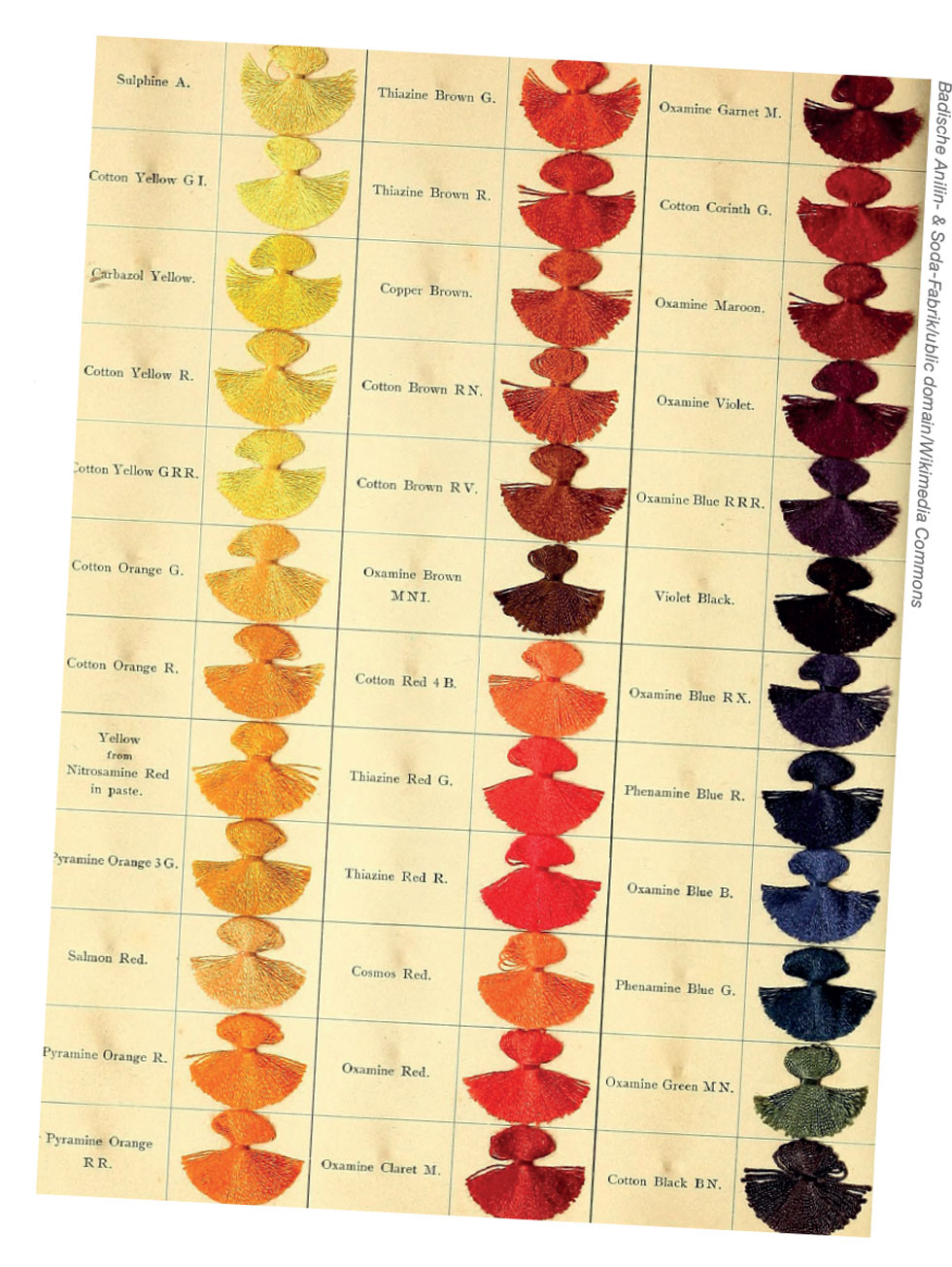 By 1900 nearly all countries imported German dyes. Cassella, founded in 1870 as “Frankfurter Anilinfarbenfabrik von Gans und Leonhardt” (Frankfurt Aniline Colours Works v Gans & Leonhardt) was the largest single dye producer in the world (in 1995 it merged with Hoechst). Along with Kalle AG (1863, also merged with Hoechst), AGFA Bayer, BASF and Hoechst they dominated the market. In 1914 with the start of World War One, there was a huge upheaval including a much larger sourcing of chemicals from petroleum. The changes this brought to the world, especially the UK, will be dealt with in another series of articles.