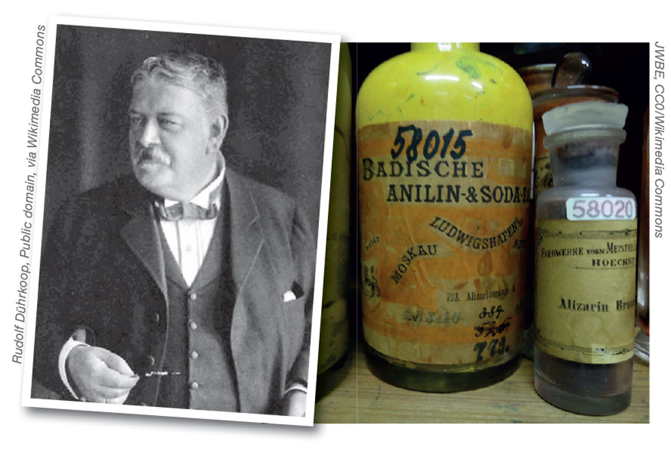 In 1868, Heinrich Caro was back in Germany and became co-managing director of BASF along with Engelhorn. His first major project was industrial production of alizarin and in 1869 he shared the patent along with the two researchers who had developed the laboratory synthesis. With his knowledge of English and England, he negotiated a successful collaboration with Perkin. However, the greater investment in research by BASF meant they were able to control both the colours produced and the cost better than the company to which Perkin eventually sold his factory and process. In fact, Perkin’s process only produced alizarin as a minor component, with a related dye as the principal one. Caro knew that different degrees of sulfonation gave colours ranging from violet to red, which they produced at will, and further improvements followed. The Germans gained control of the market by a cartel of companies, including the British one.