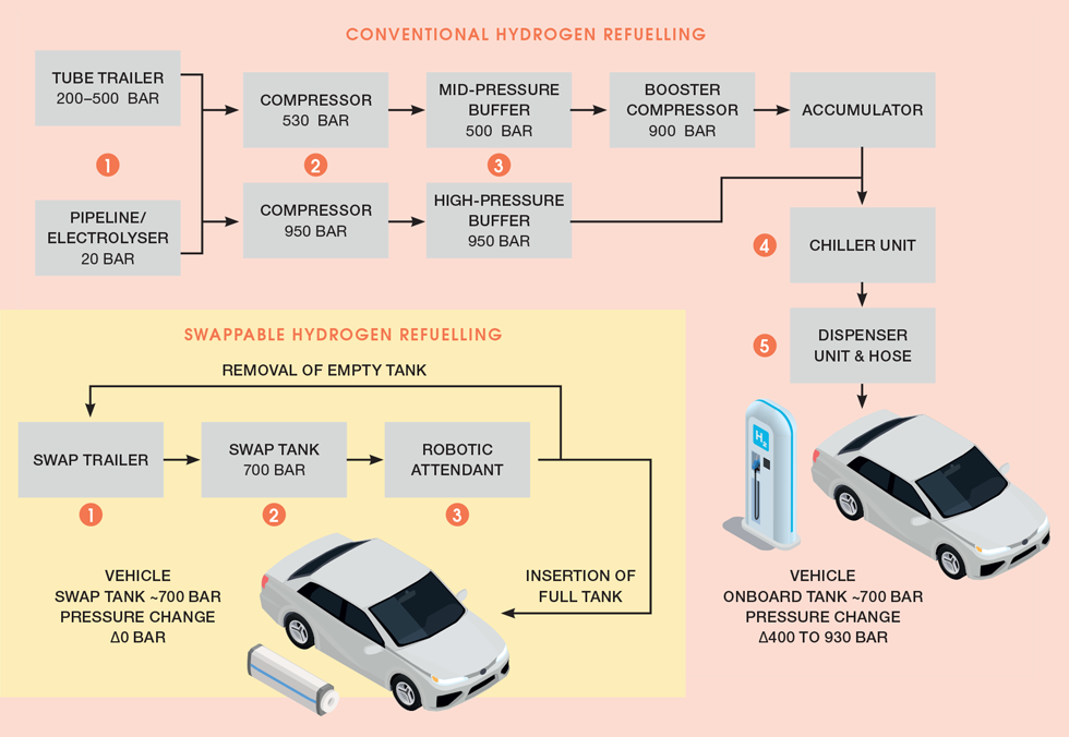 I propose a different way of refuelling via the swappable method. Empty hydrogen tanks are removed by a robotic attendant and replaced with a full tank from a nearby storage rack; the customer can then drive away. A delivery vehicle can visit the station and drop off full tanks before the empties are collected and returned to a central distribution centre. Here, they are refilled at scale using green hydrogen and compressed using renewable electricity. This can be done when energy is available at a low-cost during off-peak times and at a slow, steady pace removing the need for chilling equipment. As the gas is transported at a much higher pressure and in lighter carbon-fibre vessels, road transportation is much more efficient compared to a typical steel tube trailer. I have calculated that delivering conventional hydrogen requires ~46 MJ kg-1 while a swappable system only requires ~14 MJ kg-1 for an equivalent distance, representing a significant improvement in well-to-tank efficiency.