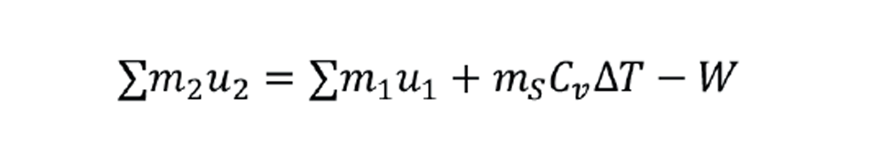 I wanted to investigate if a blowdown could be modelled as a simplified constant mass process. One that did not require complex differential equation solvers typically deployed in proprietary simulation software. An old textbook, Applied Thermodynamics for Engineering Technologists3 - describes a vessel which is segregated into compartments by a series of frictionless partition plates. Only the first compartment contains a fluid under pressure, the rest are evacuated. If the first partition is opened, the fluid expands into the second compartment, and its pressure, volume and temperature will change. This process is repeated until all partitions are open to the fluid, and the pathway can be plotted on a pressure–volume (P–V) chart. This “free expansion” is 100% irreversible – no work is done, no mass crosses the system boundary. The governing equation is the non-flow energy balance between initial and final states:
