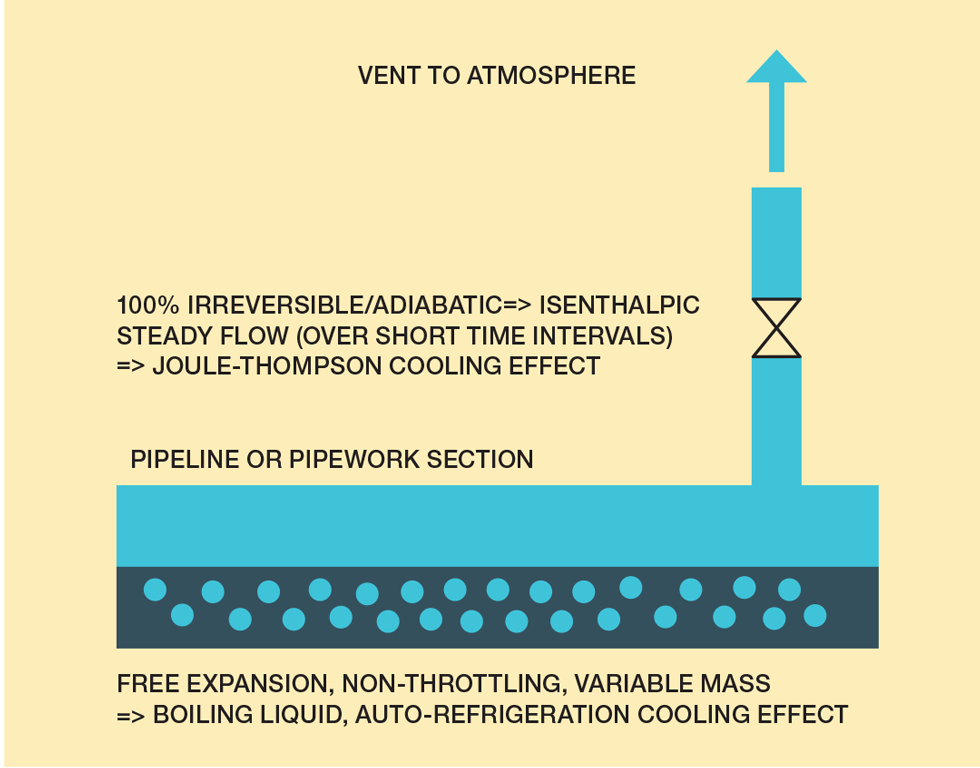 During depressurisation, CO2 can cool significantly – sometimes described as a Joule-Thomson (J-T) effect. But this isn’t strictly correct. The J-T effect applies to throttled steady-flow isenthalpic expansion through a restriction, whereas blowdown within a vessel is a closed, non-throttling process.