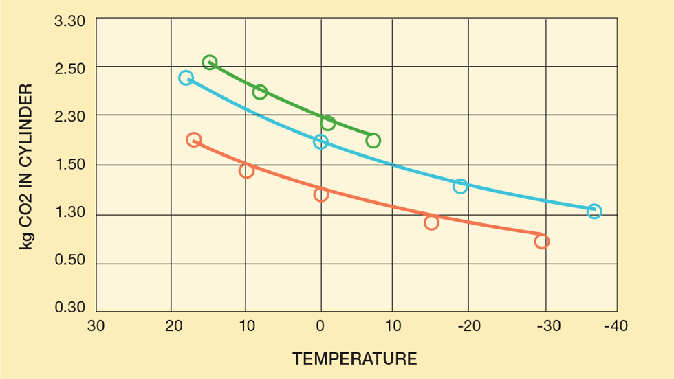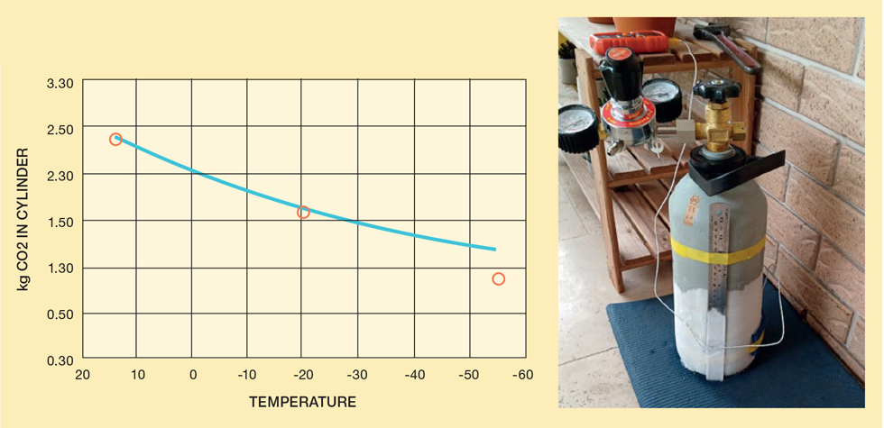 The volume of the cylinder and how much CO2 it contains is known. Knowing the cylinder’s volume and fill weight, I could calculate its starting average density and estimate the liquid and vapour fractions using the earlier method.