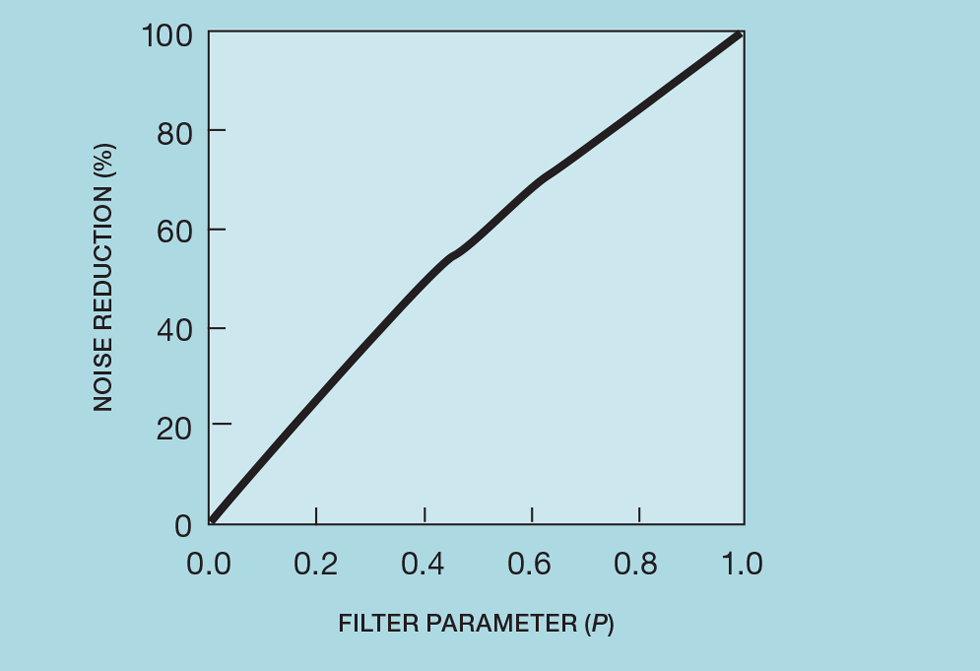 Xn is the current raw measurement, while Yn is the current filtered value and ts the scan interval. The filter is recursive, in that it uses previous filtered values (in this case just Yn-1), to determine the current value. Setting P to 0 disables the filter, setting it to 1 blocks any change in the raw measurement. P is selected to give the required level of noise reduction. Figure 1 shows that its effect is approximately linear.