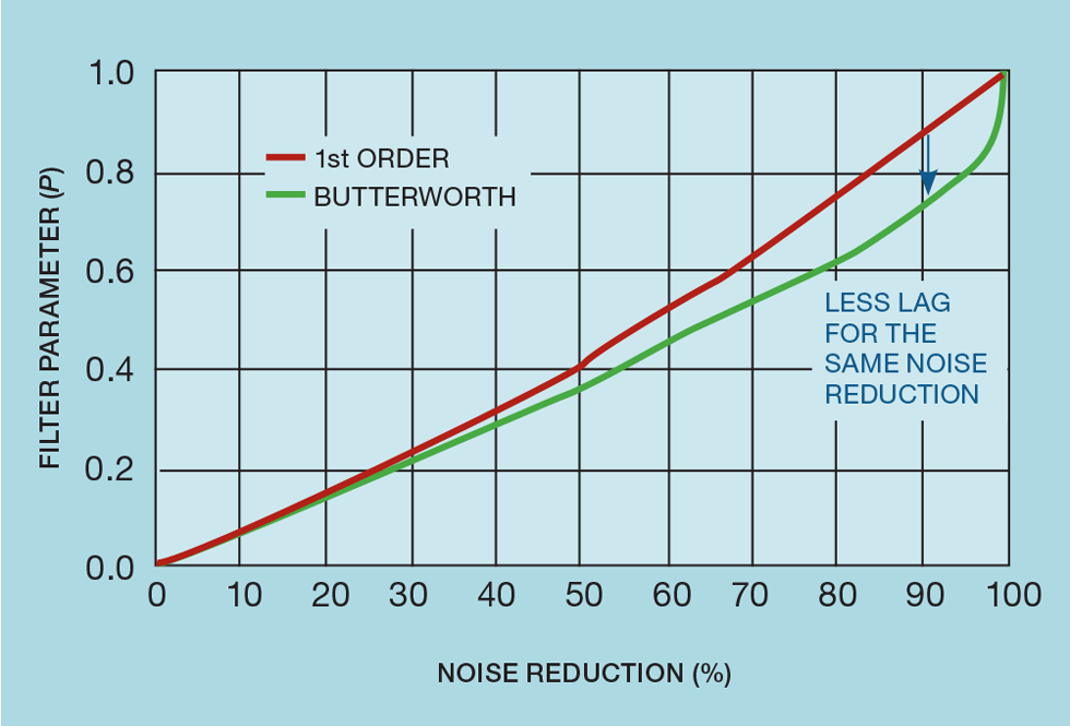 Figure 3 illustrates the advantage over the first order filter. To achieve a noise reduction of 90%, the first order filter requires a value of about 0.9 for P. The Butterworth requires a value of about 0.76. This introduces less additional lag.