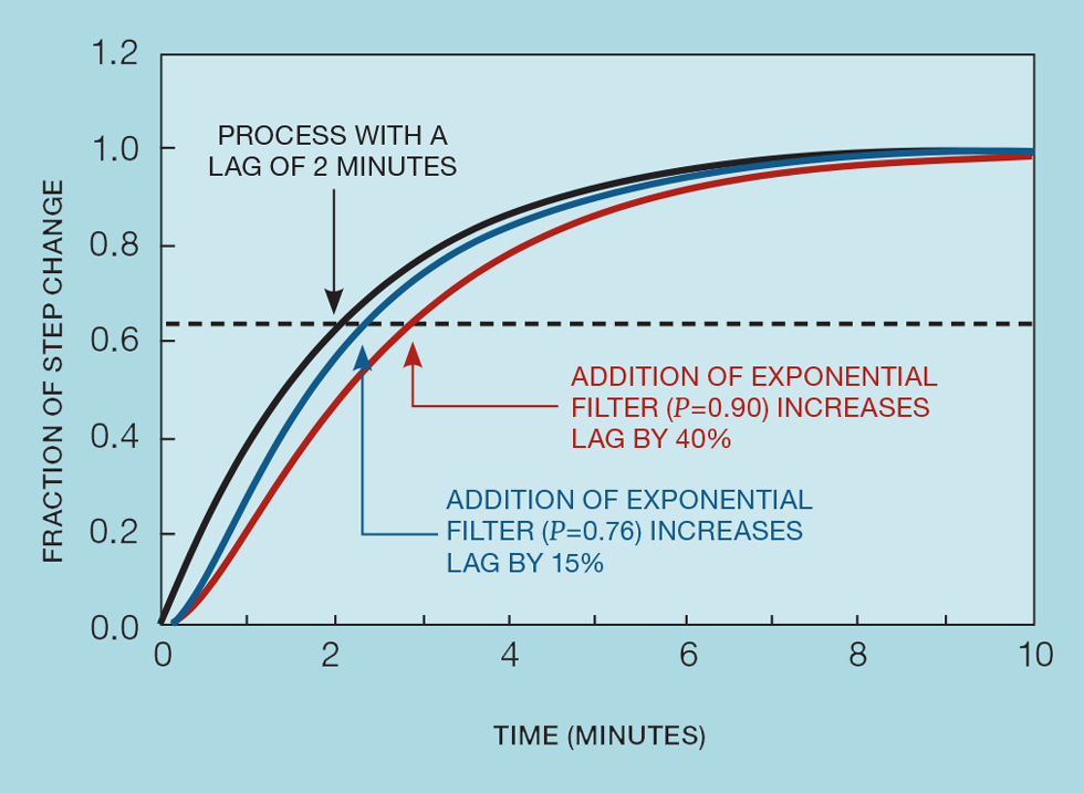 Figure 4 shows the effect of adding these filters to a process that has a lag of two minutes. Using the 63% response time as a measure of lag, the first order filter increases this by about 40% while, for Butterworth, the increase is much less, at 15%. So, if the exponential filter were added, the controller would require retuning while, with the Butterworth, it would not.