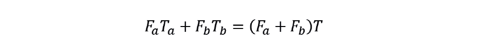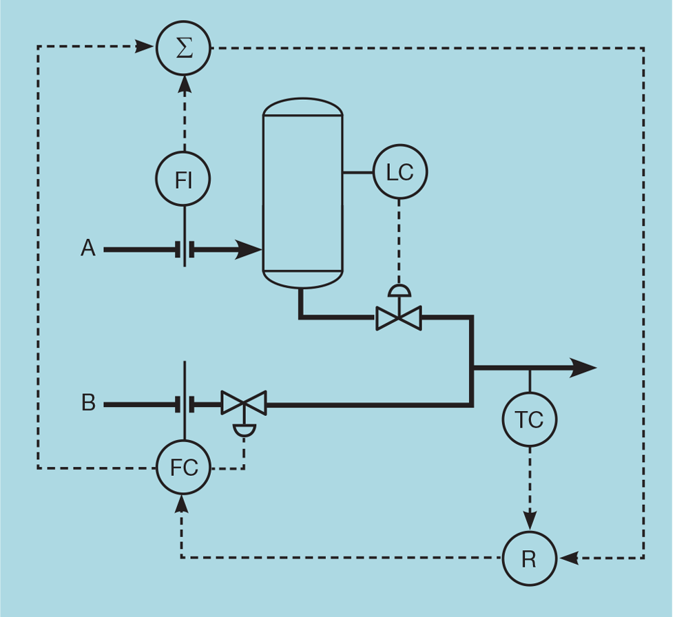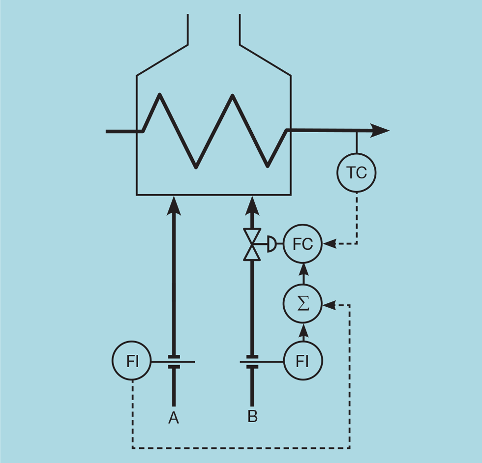 Although the simplest implementation of feedforward-feedback control, it is not the preferred solution. If Ta and Tb are the stream temperatures and T the combined temperature, we can write a simple energy balance. Assuming the specific heats of the two liquids are identical, then: