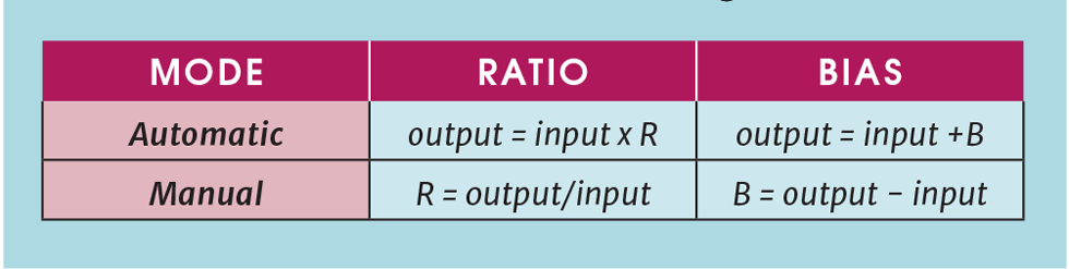 But the ratio algorithm is more than just a simple multiplication. As Table 1 shows, when in manual mode, the ratio target is kept equal to the current ratio. When switched to automatic mode, the ratio target is fixed at the current ratio and becomes available for the process operator to change as required. This tracking of the current ratio results in what is known as bumpless initialisation. There is no need for the operator to choose the target before switching the algorithm to automatic and the process is not disturbed.